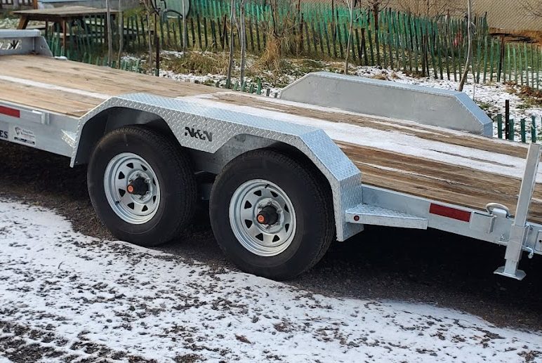 Remorque plate-forme de 25 pieds. Employée pour le transport de la nacelle sur chenille et de la pelle-mécanique.